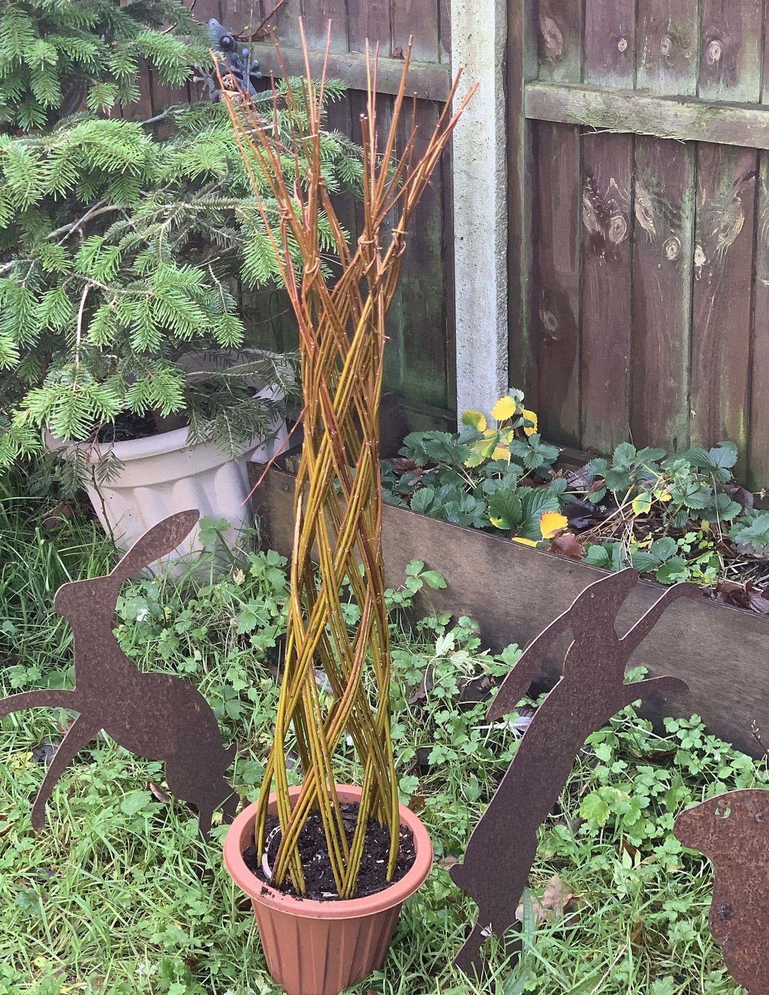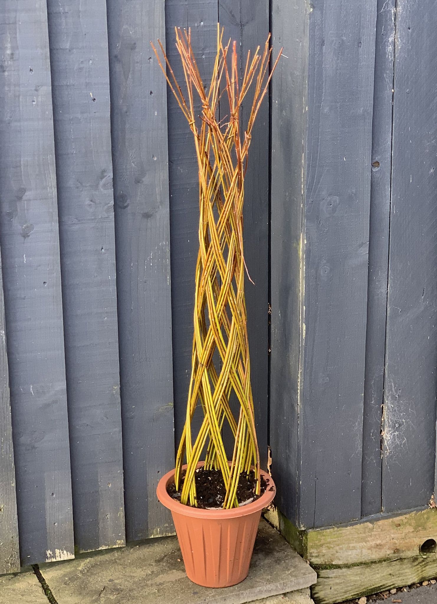 Willow is incredibly versatile and can be grown and woven into different shapes and designs. It roots quickly from a bare rod, and will start to grow and leaf in its first year. It then just needs to be woven and trimmed to help keep the shape. The tree can remain in a pot, or be planted outside. Willow is great for drying out wet areas and we recommend planting in a damp area of the garden.