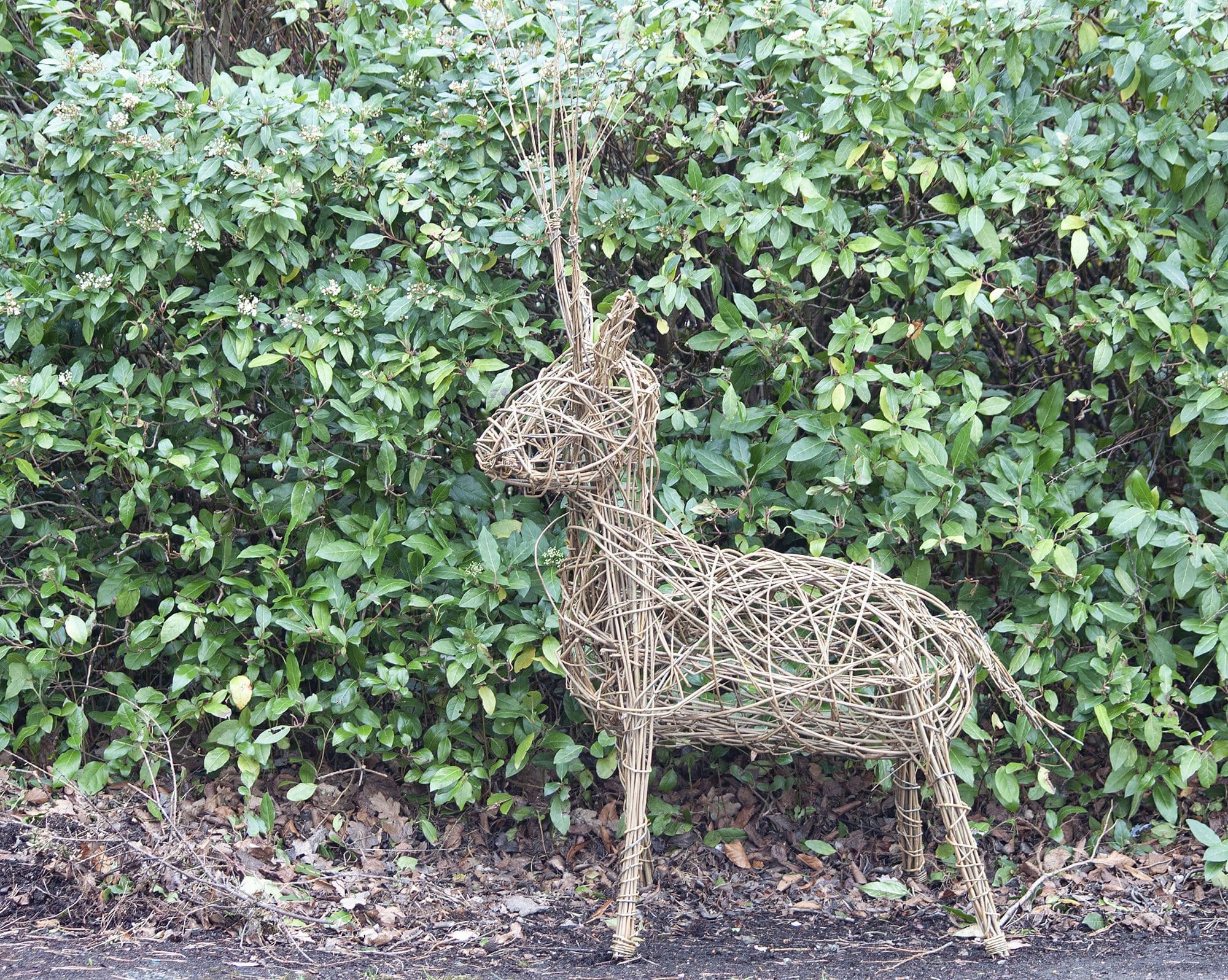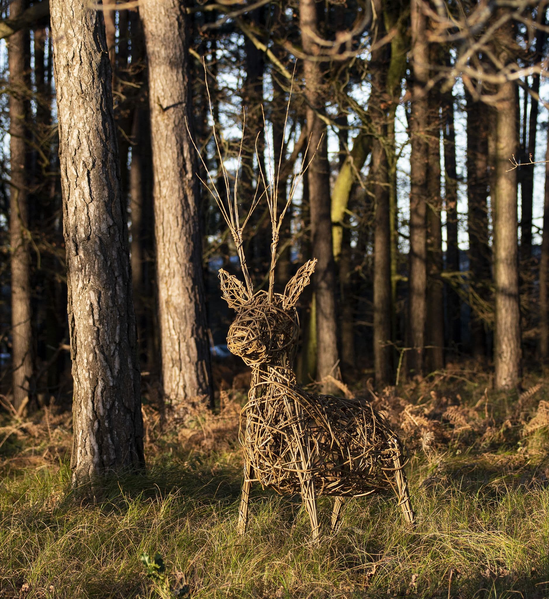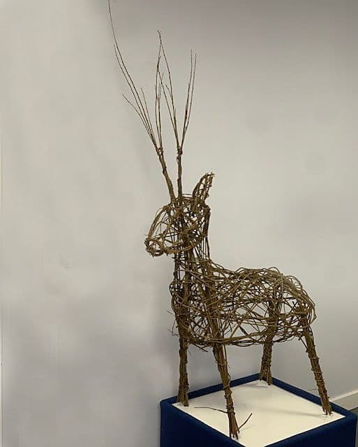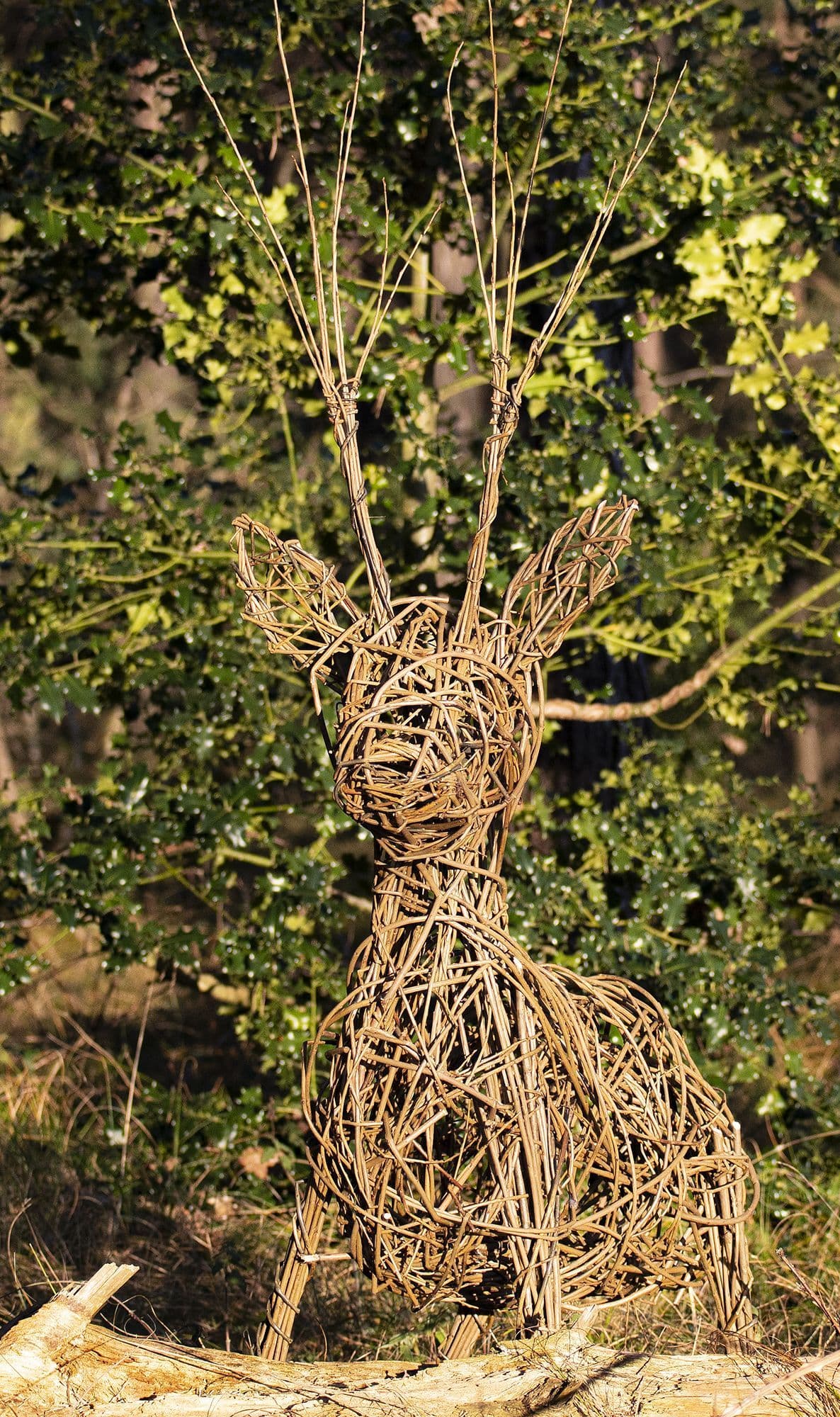 We start by making a willow framework, then weave in more willow to fill in the sculpture. Pieces usually measure around 5ft to the top of the antlers.