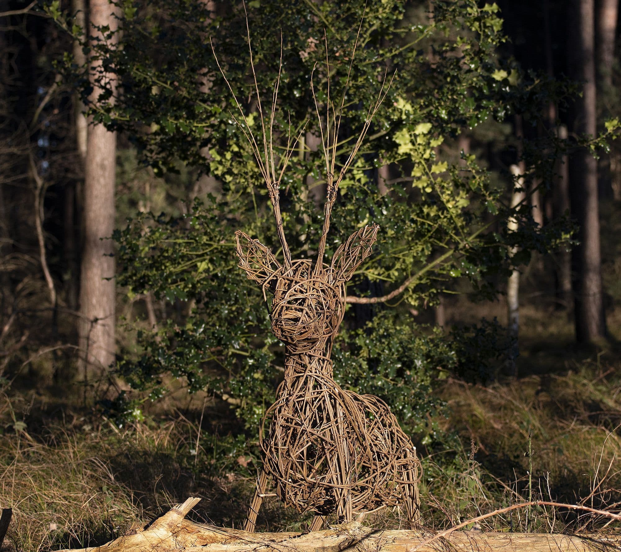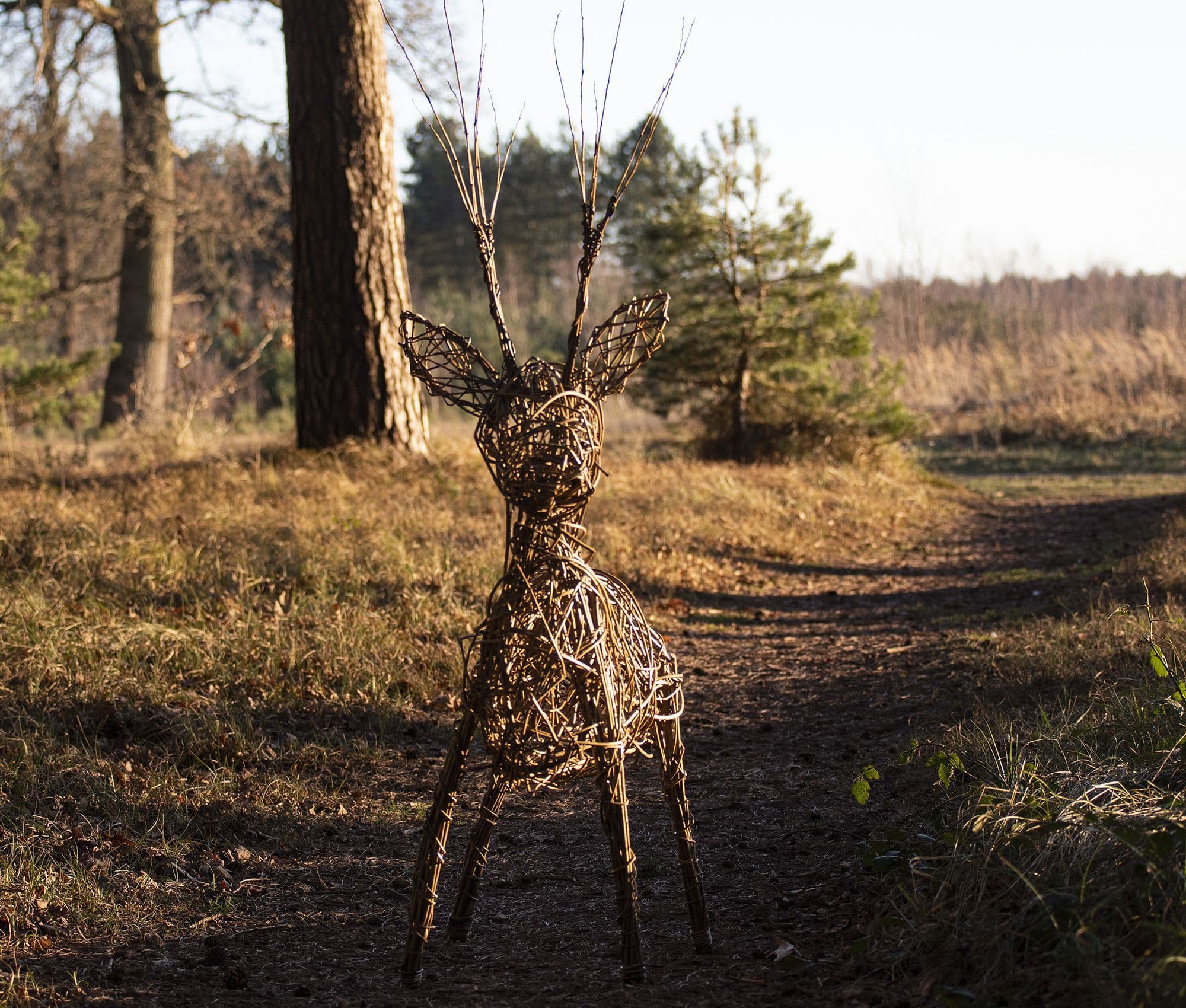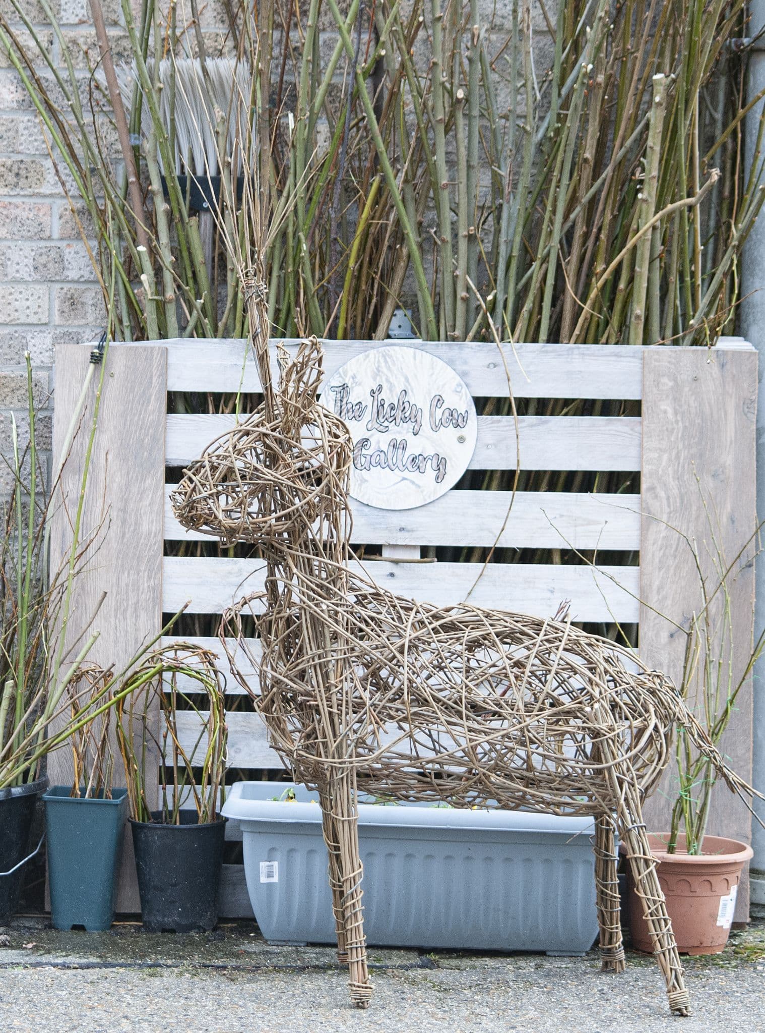 We start by making a willow framework, then weave in more willow to fill in the sculpture. Pieces usually measure around 5ft to the top of the antlers.